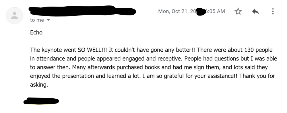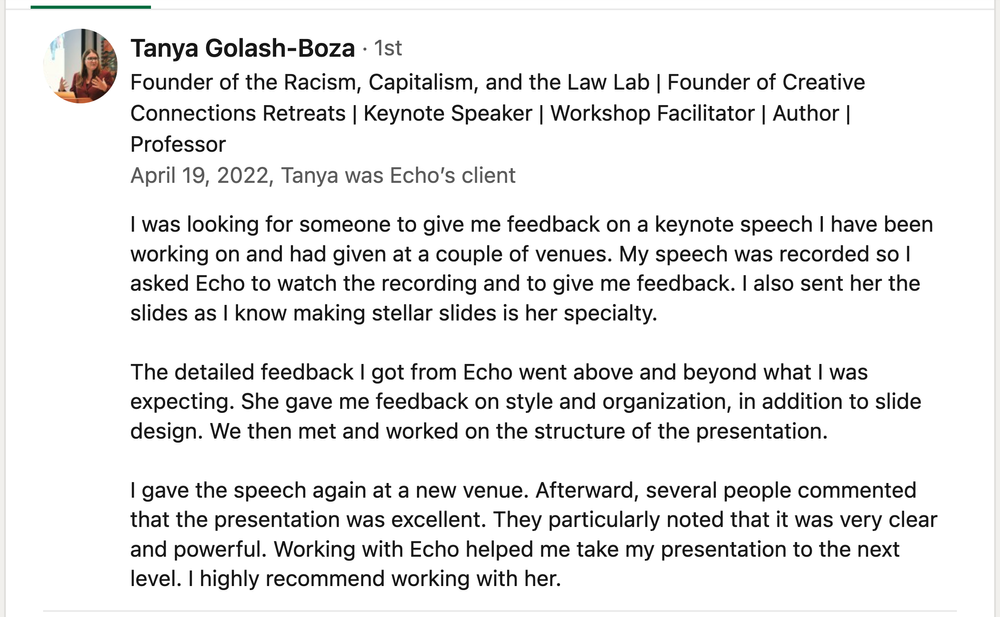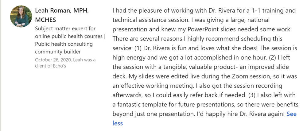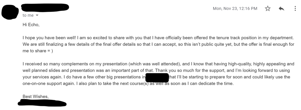 I reached out to Echo about helping me out with my teaching demonstration presentation for a job talk interview for an assistant professor position. I felt decent about my slides but really wanted help in taking it to the next level… and boy did Echo deliver! She helped me really solidify a strong introduction that shifted focus from me to my audience, helped me storyboard my entire presentation, and overall took the presentation a few levels higher than I thought my presentation could even go! I ended up feeling much more confident about my presentation and, as a result, ended up doing a great presentation and getting a job offer! I will definitely be reaching out to Echo again in the future for any of my presentation needs.